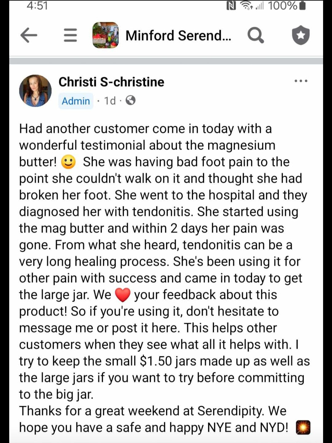 I decided to make magnesium butter, just a small batch at first, to test out what it could do. I gave some to my husband, kept a little for myself and gave some to my mother. We all had issues with pain that we wanted to try it on. Mine was a shoulder injury that I kept re-injuring from lifting our dog with mobility issues. I put it on my shoulder while it was hurting and felt instant relief. I really couldn't believe it. I thought there's just no way this is helping so much so fast, but it was. Surprisingly, both my other testers reported the same thing. So I was ready to make a bigger batch and give samples out to people to see if it would help them. I'm sure it depends on the type of pain.. ours was all muscle related. There are many other reported benefits from topical magnesium so you may want to try it for another reason.